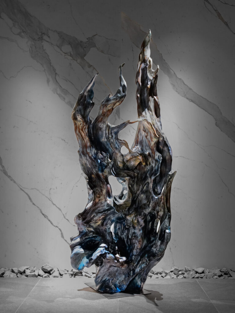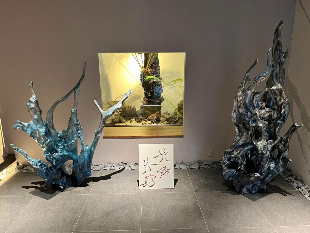 仲垣さん:2mぐらいあります。もともとはフラットな面が多かったんですが、炎に見立てて彫刻して、グラデーションのペイントを施しました。日本画に用いられる岩絵具って顔料があるんですけど、それを樹脂に混ぜて七層ほどに重ねて、光が当たるところで色が変わるような仕掛けをつくっています。こちらは二年前かな?積水ハウスさんとのコラボで、ちょっと豪華な建築物を一棟貸していただいて、作品を展示しました。