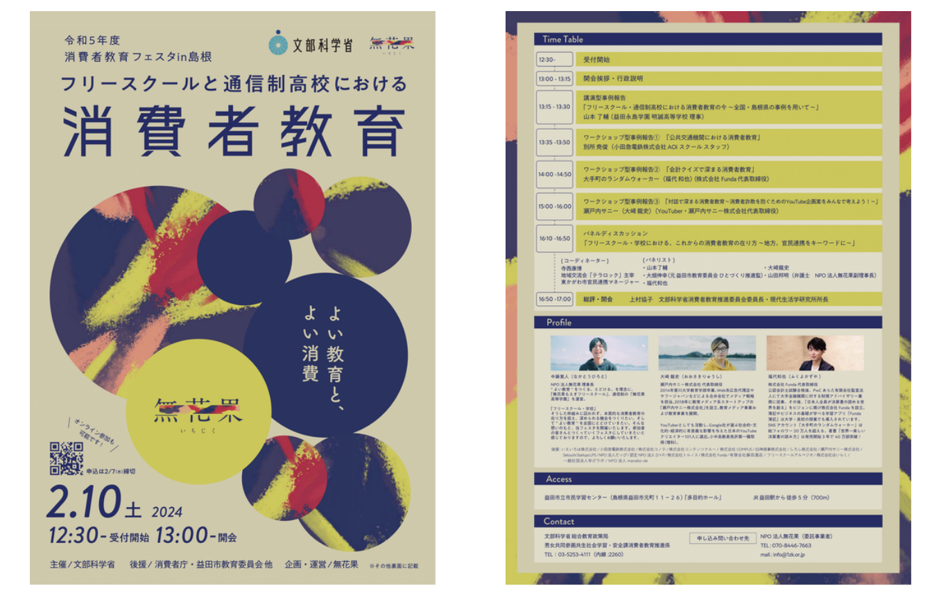 2024年2月10日(月)に、文部科学省の委託事業として「消費者教育フェスタ in 島根〜フリースクール・通信制高校における消費者教育〜」を開催しました。
